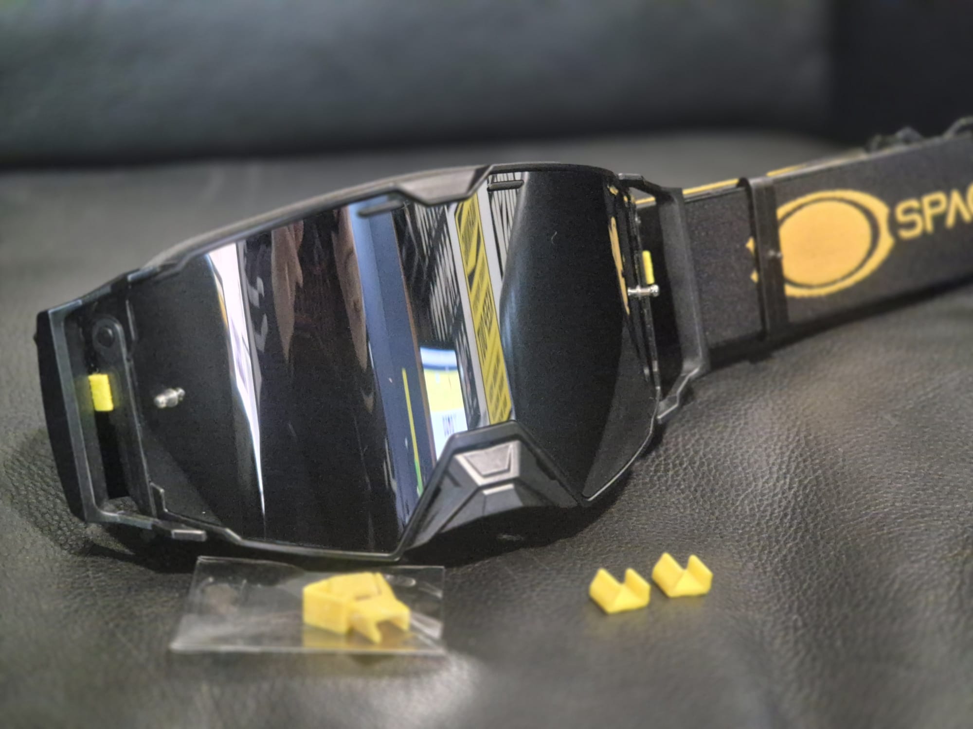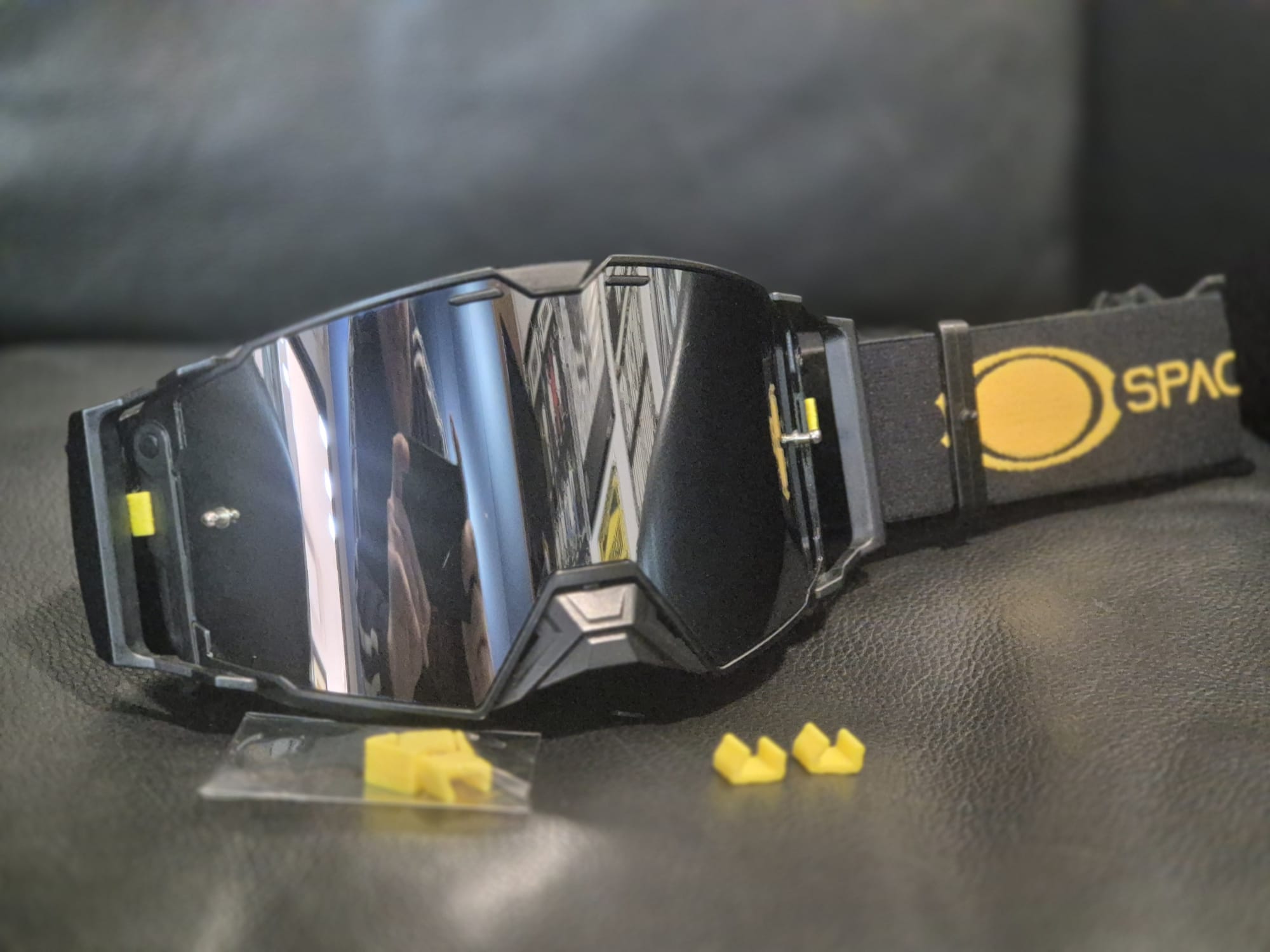 La maschera Space One è il frutto di 40 anni di esperienza nell’off-road, offrendo un dominio senza precedenti al pilota moderno. Progettazione e design sono interamente italiani. È l’unica maschera ad avere un sistema di sgancio rapido che consente di cambiare la lente in meno di 5 secondi. Le due linguette laterali calamitate garantiscono la massima aderenza della lente alla maschera completando il serraggio con n.2 morsetti a pressione di colore giallo fluo. La spugna superiore è stata lavorata con microfori, aumentando la circolazione dell’aria e massimizzando l’evacuazione dell’umidità. La fascia elastica della maschera, larga 48 mm e dotata di tre linee in silicone per la massima aderenza, è facilmente rimovibile e lavabile a freddo in lavatrice. Il paranaso è completamente removibile.